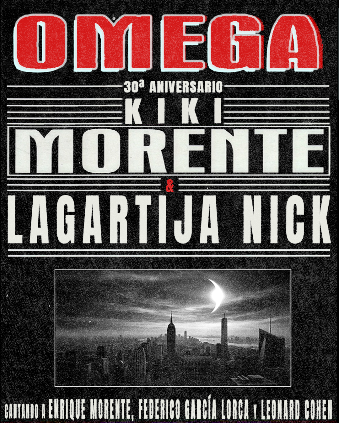 Diciembre de 1996. Nació un disco; se abrió una grieta. Di Lo que los guardianes de la pureza recibieron con incomprensión y rechazo, el tiempo lo ha consagrado como obra fundamental de la música española. Omega abrió una puerta que ya no se ha vuelto a cerrar. Lo que ayer fue ruido, hoy es canon. Cuatro fuerzas colisionan en el epicentro de este terremoto: el genio inquieto de Enrique Morente, el rugido de Lagartija Nick, la poética herida de Lorca, la liturgia emocional de Leonard Cohen Hoy, las cifras se alinean en una conjunción casi profética: treinta años de Omega, noventa años de la ausencia de Lorca, diez años del silencio de Cohen. Como astros regresando a su conjunción original, esta efeméride nos recuerda que las obras maestras no habitan en el calendario, sino en un pulso que atraviesa los siglos.. Fue un acto de libertad casi suicida. Un diálogo salvaje entre el metal y el quejío, impulsado por una fe imprudente en el abismo. Sus creadores, piratas de la ortodoxia, zarparon sin mapas, guiados por una brújula mística que señalaba el destino, pero jamás el camino. Pudieron haber naufragado en la irrelevancia… pero desembarcaron en la eternidad. De naturaleza intempestiva, Omega suena fuera de época, de atemporalidad radical. No pertenece a un estilo ni a una generación sino que permanece como una corriente subterránea que emerge cada vez que alguien entiende la música como territorio sin fronteras. Este homenaje no busca reproducir Omega, sino navegar como Morente. No persigue el eco, sino el incendio. No imita la obra: reactiva el peligro. En escena, Lagartija Nick, custodios del estallido original, se entrelazan con la voz de Kiki Morente. Él no convoca el legado como recuerdo, sino como llama viva, una continuidad que respira desde su propio tiempo. Vuelve la aventura. Vuelve el riesgo. Vuelve la música concebida como Morente, un acto total, donde el sonido, la palabra y el gesto forman un todo hiere y sana. Enrique Morente sigue aquí, su voz nos empuja, una vez más, al borde del abismo y, como él decía, “Vamos a tirar p’alante, que estamos vivos de milagro.